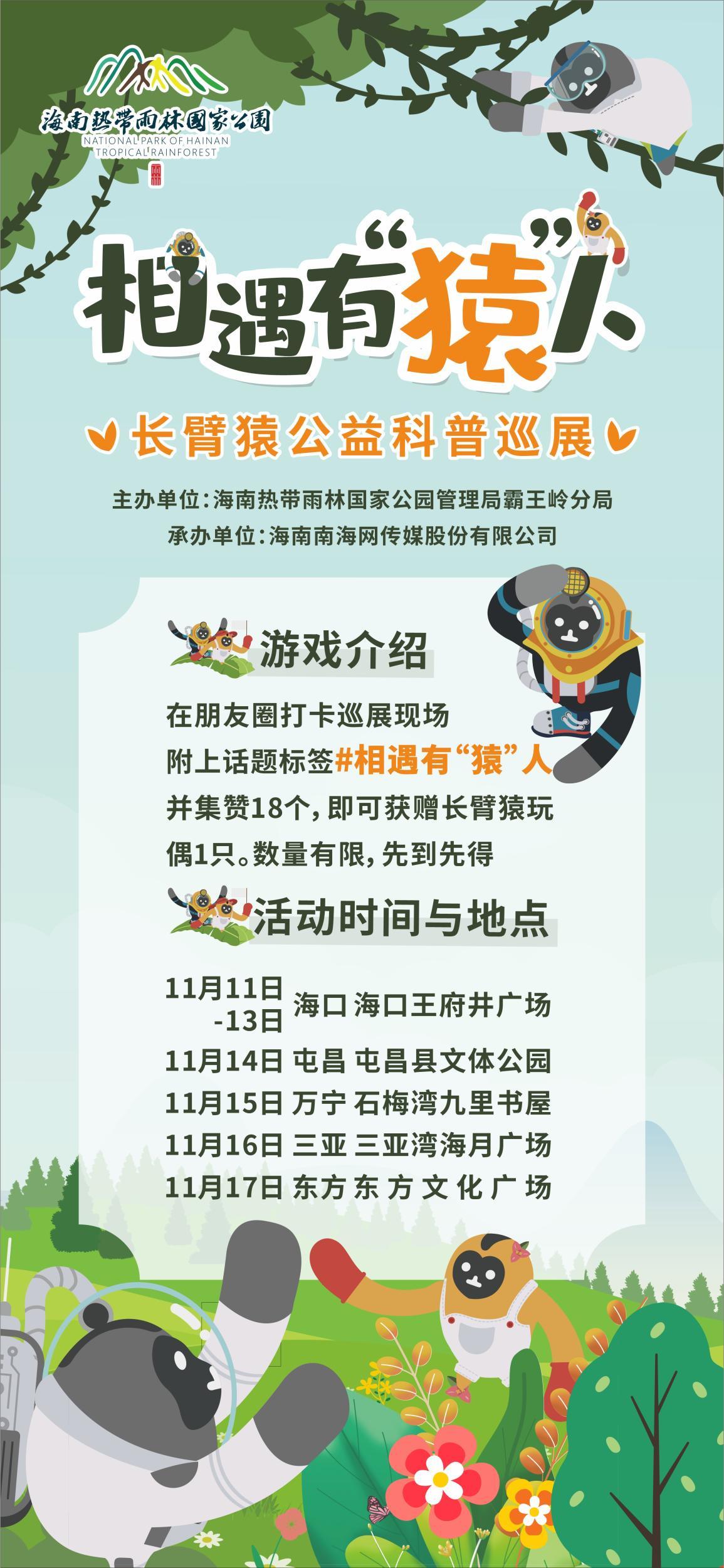 “相遇有‘猿’人”海南长臂猿公益科普巡展活动将于11月11日至11月17日分别在海口王府井广场、屯昌县文体公园、万宁石梅湾九里书屋、三亚湾海月广场以及东方文化广场进行。展览将通过图片展示长臂猿的生活习性、栖息地以及保护成果等内容,让观众近距离感受长臂猿的魅力和可爱之处。同时,还将设置互动体验区,让观众亲身参与,了解长臂猿的行为特点和生活方式。此外,活动还将特别赠送海南长臂猿玩偶,让观众可以更深入地了解和喜爱这个珍稀动物。